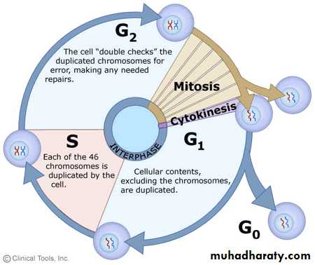 Some cells, such as skin cells, divide continuously throughout the life of the organism. Other cells, such as skeletal muscle cells and nerve cells, are arrested in the G1 stage. Cardiac muscle cells are arrested in the G2-stage.
