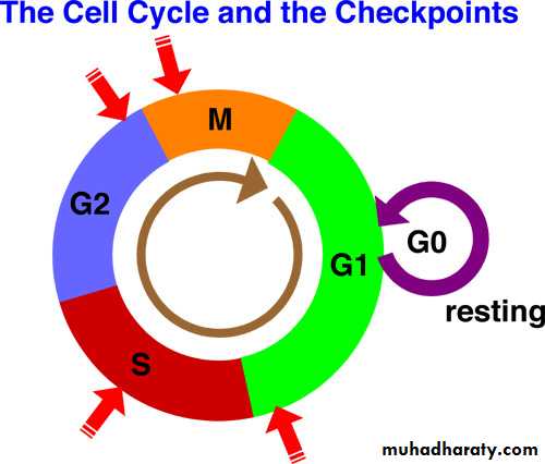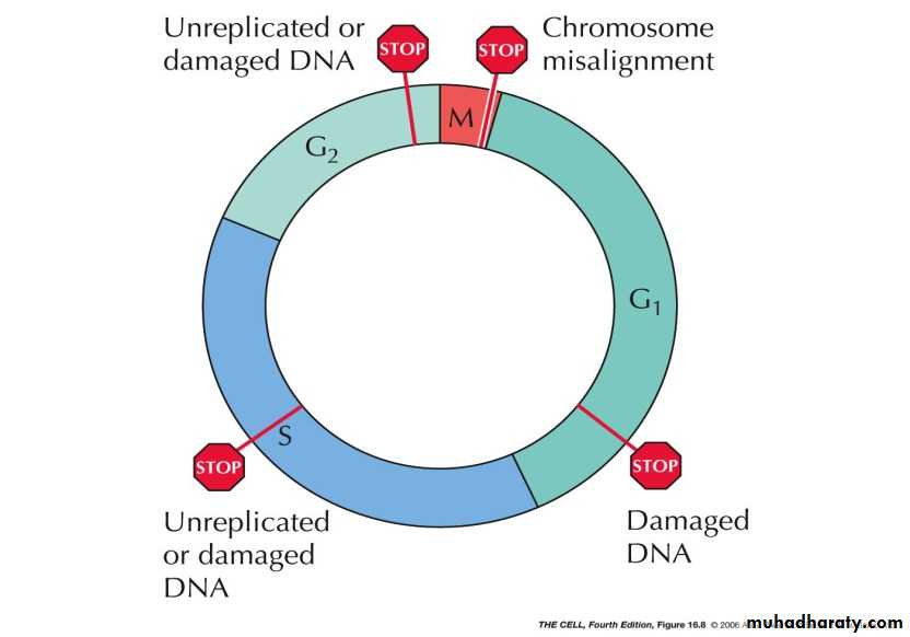 between cell- cycle stages. Checkpoints are biochemical circuits, that detect external or internal problems and send inhibitory signals to the cell-cycle system.There are four major types of checkpoints.