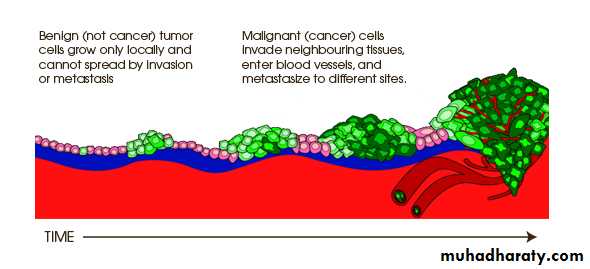 Malignant: rapid growth & invade other tissues, spreading throughout the body (metastasis). Only malignant tumors are properly referred to as cancer. Malignant tumors are formed from abnormal cells that are highly unstable and travel via the blood stream, circulatory system and lymphatic system.