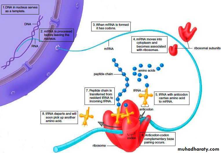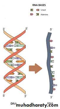 2- During transcription one strand of DNA serves as a template for formation of mRNA. The bases in mRNA are complementary to those in DNA, every three bases is a codon that codes for amino acid.