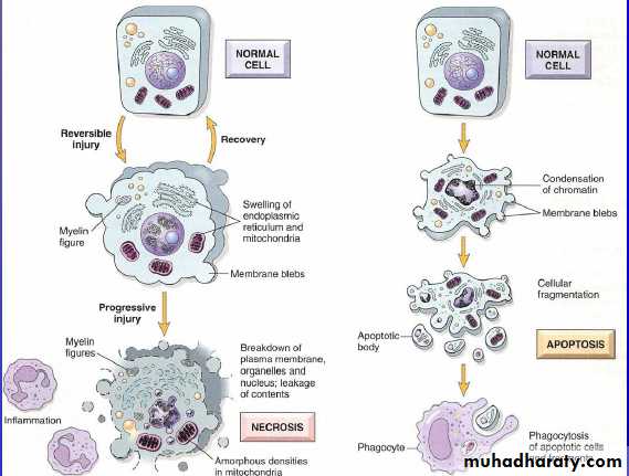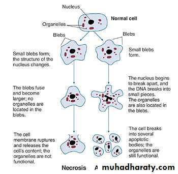 The accidental death of cells, a pathologic process , is called necrosis, necrosis can be caused by microorganisms, viruses, chemicals, and other harmful agents. Necrotic cells swell, their organelles increase in volume, and finally burst, releasing their contents into the extracellular space macrophages engulf the debris of necrotic cells by phagocytosis and secrete molecules that active other immunodefensive cells to promote inflammation.