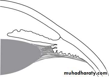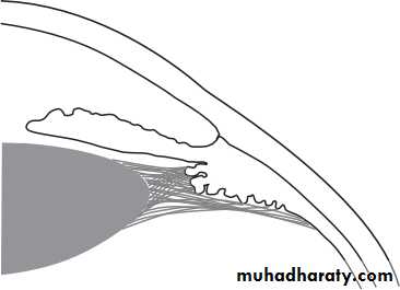 • The lens lies behind the iris and is supported by fine fibrils (the zonule) running between the lens and the ciliary body.