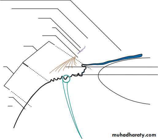 • The angle formed by the iris and cornea (the iridocorneal angle) is lined by a meshwork of cells and collagen beams (the trabecular meshwork). In the sclera outside this, Schlemm’s canal conducts the aqueous humour from the anterior chamber into the venous system, permitting aqueous drainage. This region is termed the drainage angle.