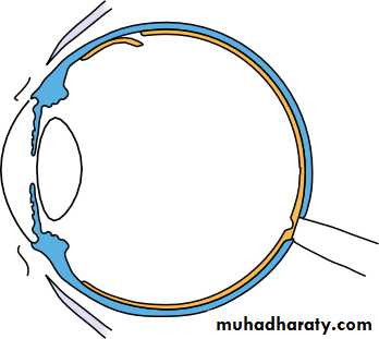 • Between the cornea anteriorly and the lens and iris posteriorly lies the anterior chamber. Between the iris, the lens and the ciliary body lies the posterior chamber). Both these chambers are filled with aqueous humour. Between the lens and the retina lies the vitreous body.