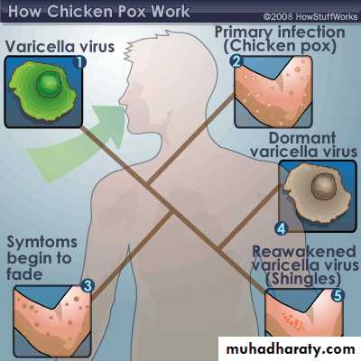 The virus also is carried to the respiratory mucosa toward the end of the incubation period, which is the reason for communicability before the onset of rash.Following viremia, the virus becomes latent in dorsal root ganglia cells. It remains there until reactivation, at which time the virus travels back to the skin along the sensory nerve.