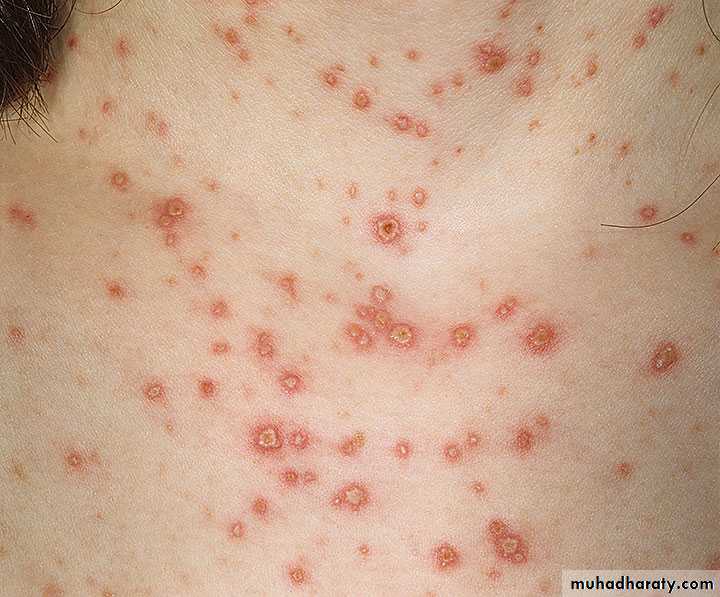 The crusting of the vesicles is the final stage of the lesions before resolution, and scarring occurs rarely.