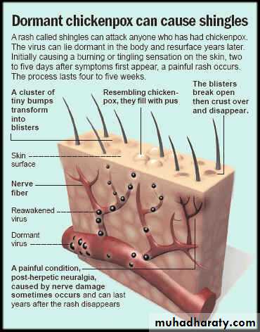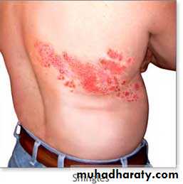 Herpes Zoster• The most common sites are those supplied by the trigeminal nerve and the thoracic ganglia.