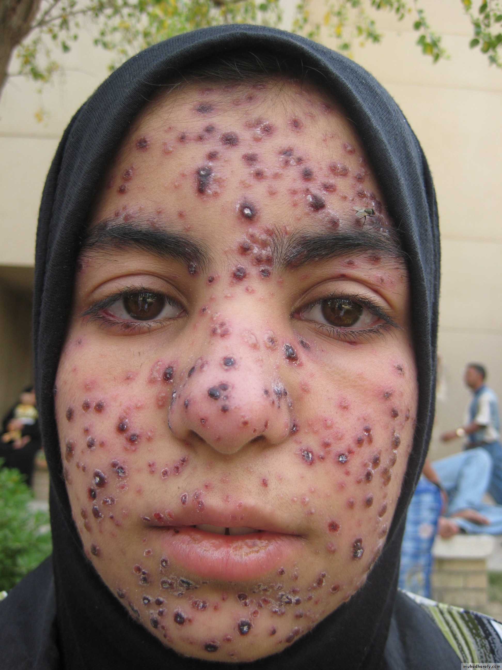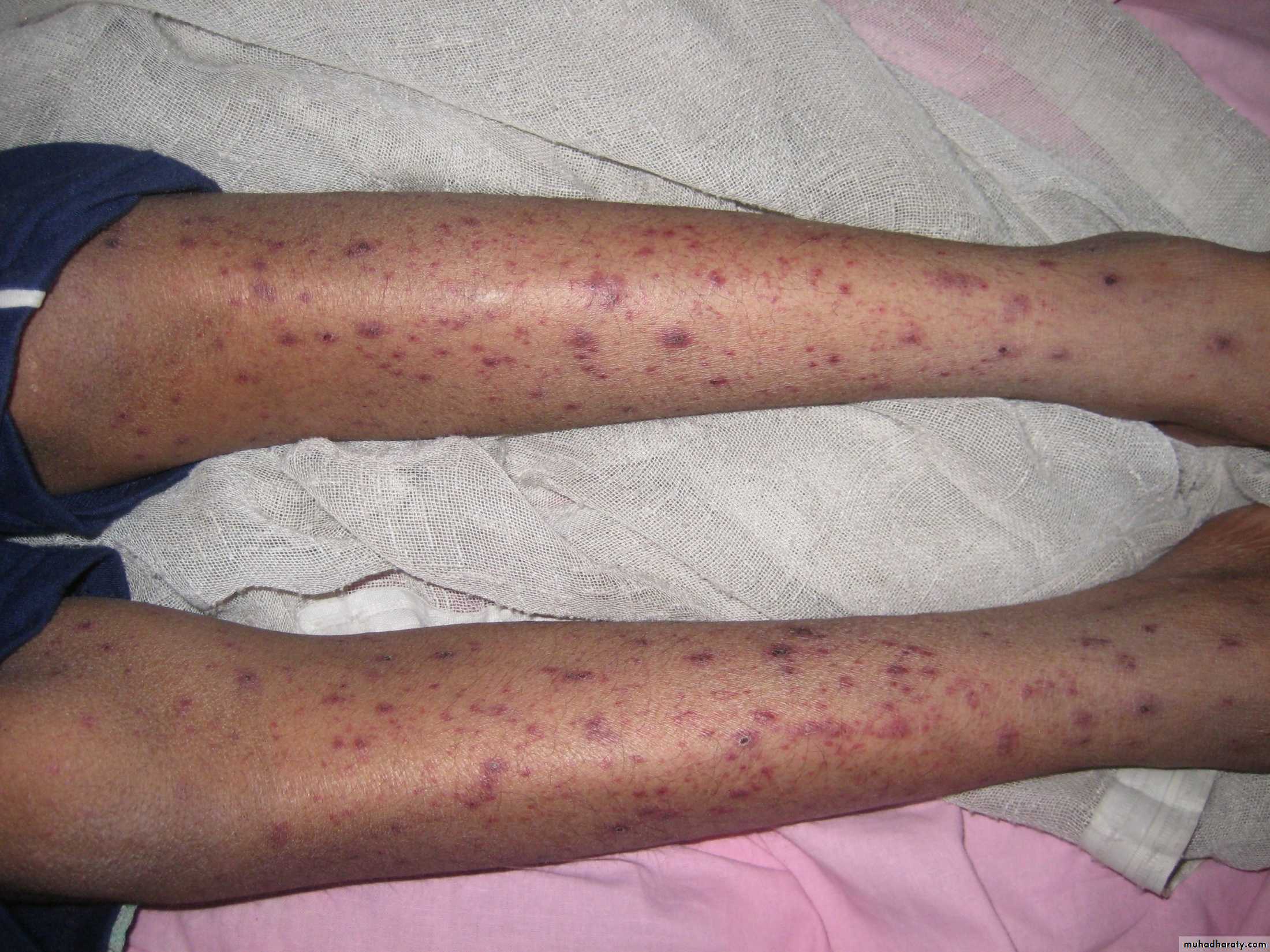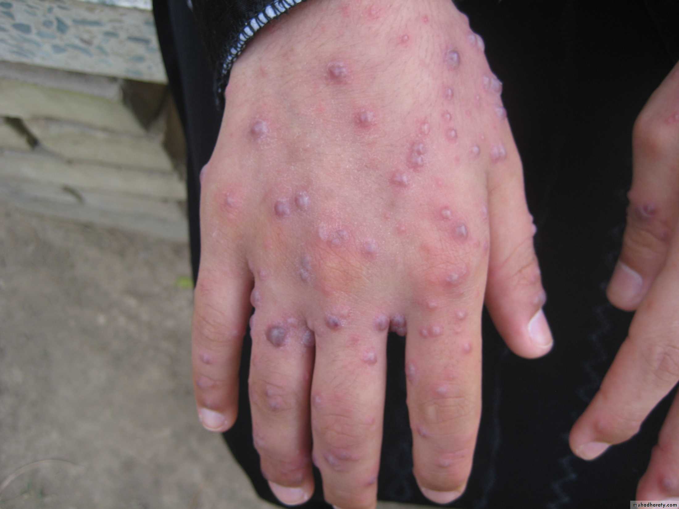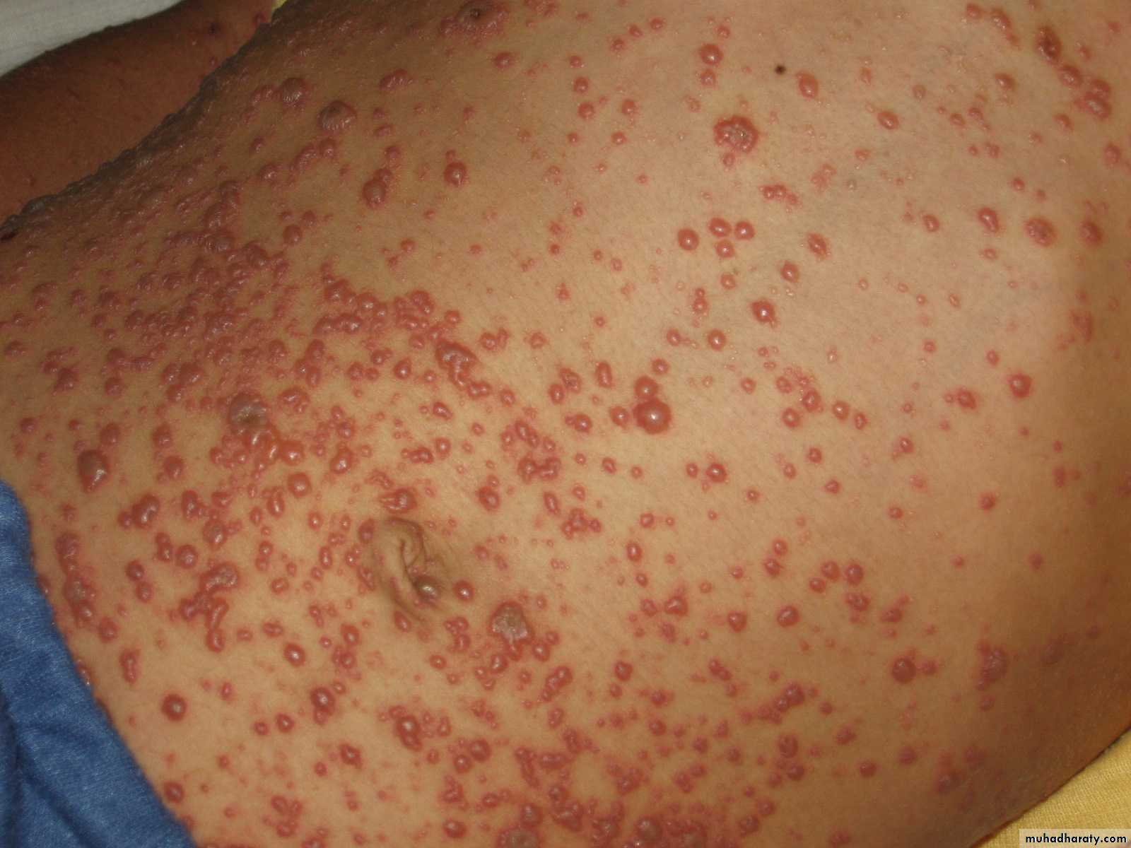 One of the most characteristic features of the exanthem is the presence of all stages of lesions simultaneously.