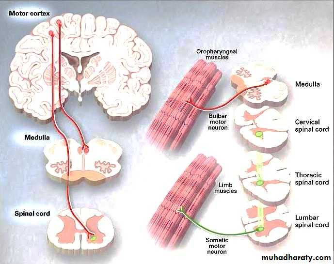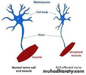 Motor neuron disease e.g.(amyotrophic lateral sclerosis) is a progressive neuronal degenerative disease that leads to severe disability and death begins between the ages of 30 and 60 years , It is characterized by degeneration of anterior horn cells in the spinal cord, motor nuclei of the lower cranial nerves in the brainstem, and corticospinal and corticobulbar pathways. So there is features of combination of upper motor and lower motor type (characterized clinically by wasting, weakness and fasciculation of the affected muscles with hyperreflexia. without accompanying sensory, cerebellar, sphincter or ocular muscles involvements.