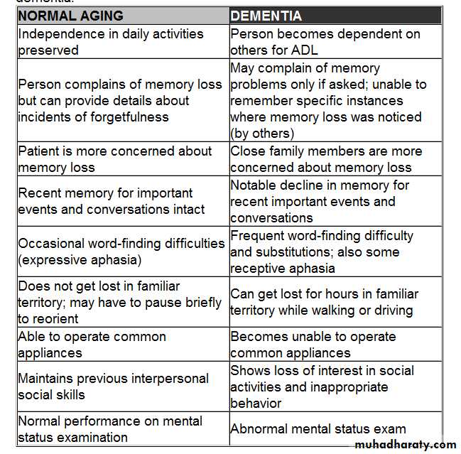 This woman is an elderly patient with forgetfulness. word finding aphasia. impairment of daily functioning. and insomnia. Of these symptoms. the most specific for dementia is impairment in functioning. Social and personal functioning requires performance of activities of daily living (e.g. personal hygiene. dressing. food acquisition and intake. self administration of medications). navigation through surroundings. and the ability to operate common appliances. This patient shows deficiencies in at least two areas of functioning. Forgetfulness. word finding aphasia. and insomnia can occur with normal aging and are therefore less specific for dementia. However, many patients with age-related memory loss will not get lost in common settings nor will they have poor recollection of when they experienced memory loss. The table below summarizes the changes in normal versus dementia.