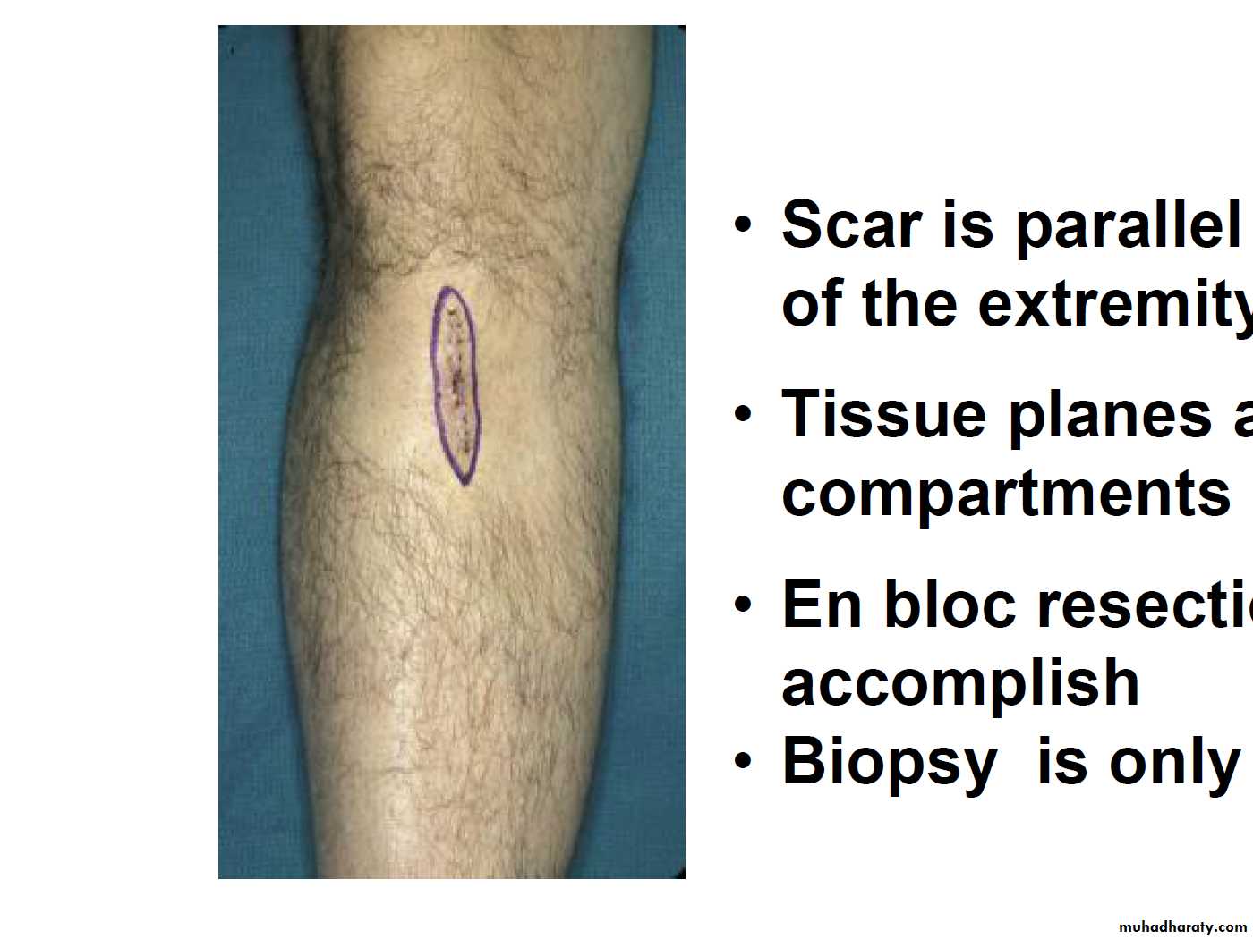 • •Scar is parallel to the long axis of the extremity• •Tissue planes and compartments are intact