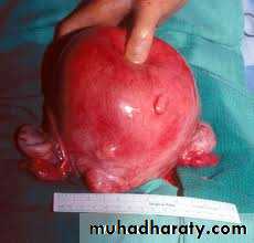 Usually in pregnancy or near menopause that lead to fibromyomatous pattern,( thrombosis of peripheral vessels, absence of cell nuclei, the blood vessels distended and become thin wall and engorged with R. B. C.s ,the tumor stained red and resemble raw meat ,it give fishy odor on cutting due to fatty acids, cystic degeneration may occur in the center and the cyst full with greasy brown debris