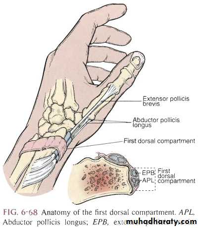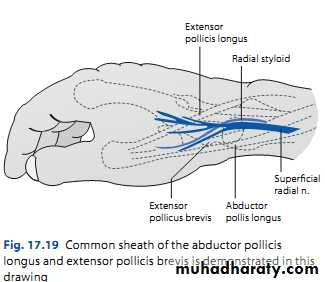 Thickening of synovial sheath around extensor polices brevis and abductor polices longus in the first extensor compartment due to overuse.DE Quervain’s disease