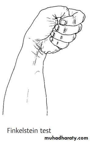 Fenkelstein’s test; pain over the radial styloid induced by flexing the thumb in the palm and abduction of the wrist.