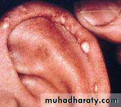 Classic sites include the pinna of the ear, bursas around elbows and knees, the dorsal surfaces of the metacarpophalangeal joints, and the Achilles tendon.