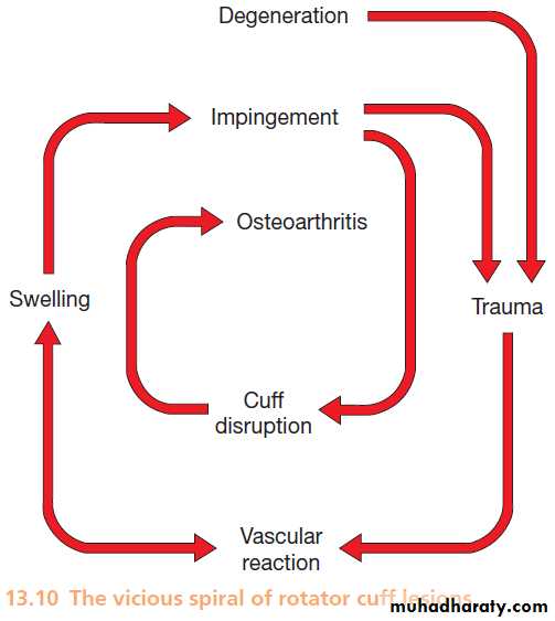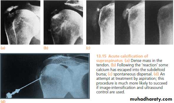 Acute shoulder pain may follow deposition of calcium hydroxyapatite crystals, usually in the ‘critical zone’ of the supraspinatus tendon.local ischaemia leads to fibrocartilaginous metaplasia and deposition of crystals by the chondrocytes.