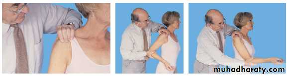 a painful disorder which is thought to arise from repetitive compression or rubbing of the tendons (mainly supraspinatus) under the coracoacromial arch.The impingement position(abduction, slight flexion and internal rotation)