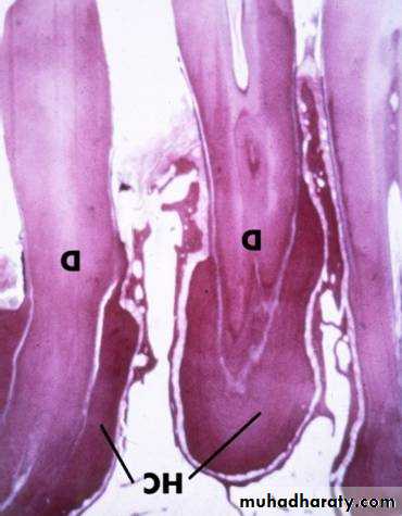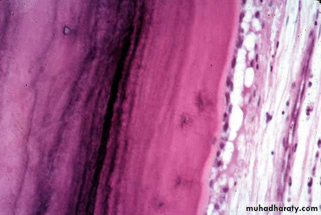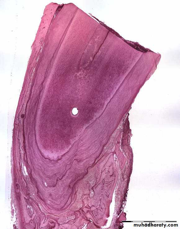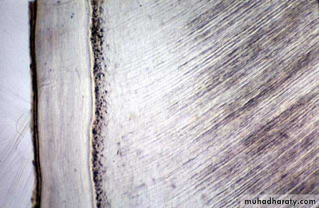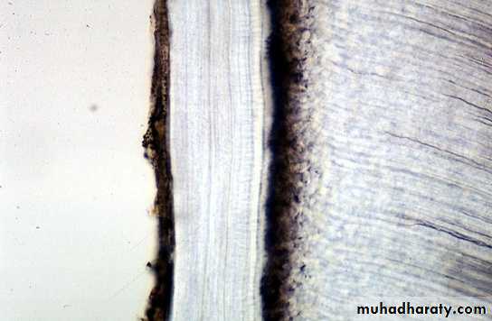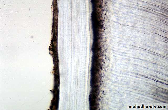 Sometimes dentin is separated from the cementum by a zone known as intermediate cementum.This layer is seen mostly in apical 2/3rd of Molars and Premolars.
