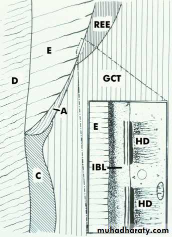 30% cementum meets the enamel in a sharp lineGapping:10% cementum and enamel doesn’t meet because of delayed separation of epith root sheath of Hertwig (area of dentin not covered by C).