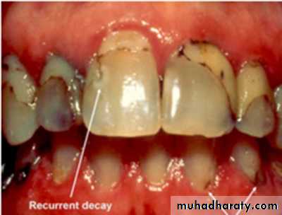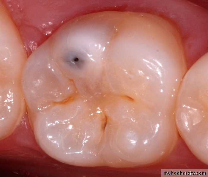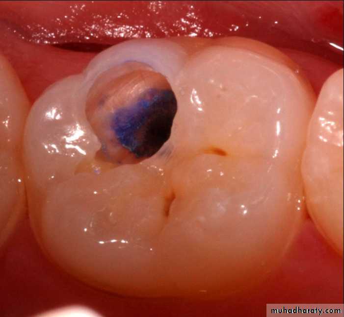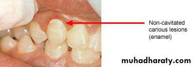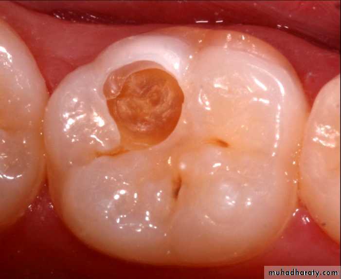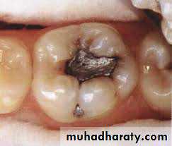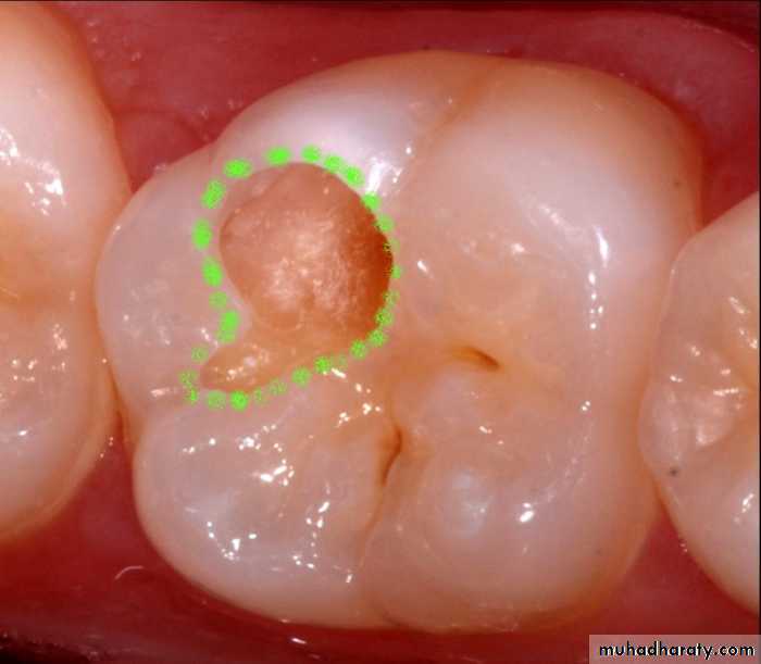 Where there is visual breakdown of a tooth surface, it is classified as cavitated carious lesion. An active cavity on a smooth surface has soft walls or floors as shown below:Secondary caries