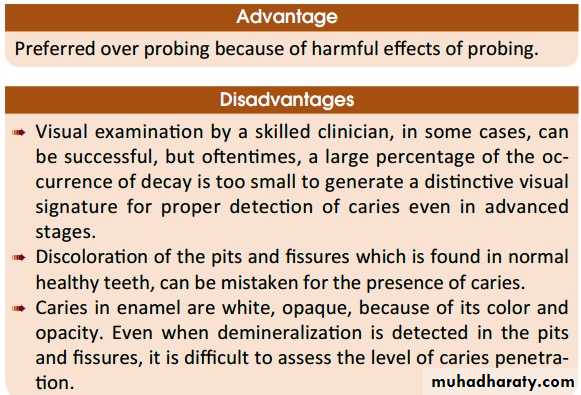 DisadvantagesSharp edge of explorer may fracture the demineralized enamel, if left alone, such lesion could have remineralized and reverted back to normal.
