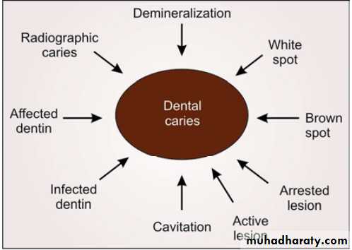 • As we know dental caries is an infectious disease, but there are many terms which describe the signs of the disease, for example, cavitation, white or brown spot, affected or infected dentin, etc