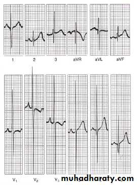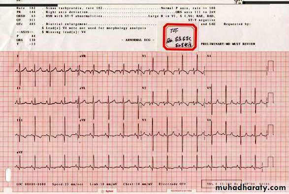 • LVH; Sinus tachycardia, and ST-T changes are the most common findings. Left or right atrial hypertrophy (LAH or RAH) may be present.