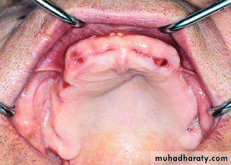• The mylohyoid ridge is smoothened or resected with a bur.