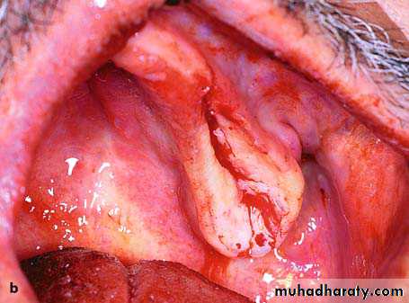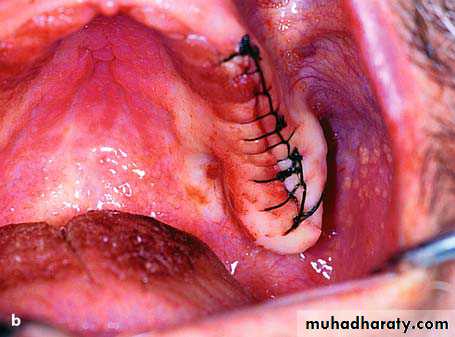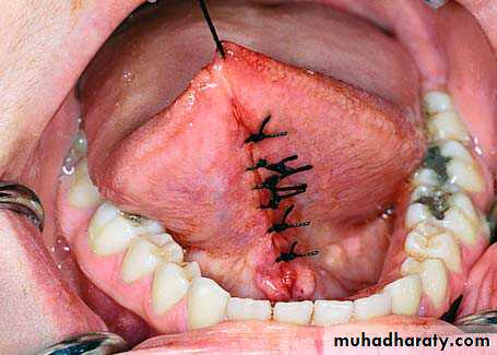 • Strict hemostasis should be obtained prior to closure of the lingual flap otherwise life-threatening airway restriction may occur due to hematoma formation in the floor of the mouth.