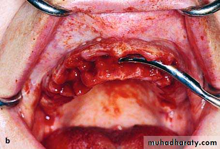• Subperiosteal dissection is continued under the lingual mucoperiosteum until the genial tubercles and muscles become evident.