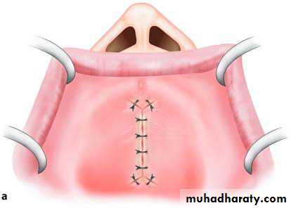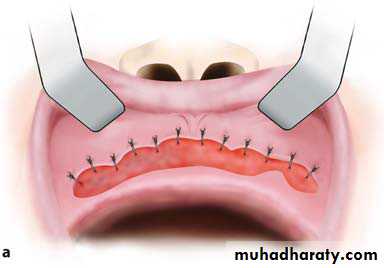 and scissorsSuturing of superior lip of incision with periosteum that has not been reflected, to avoid a decrease of the depth of the mucolabial fold