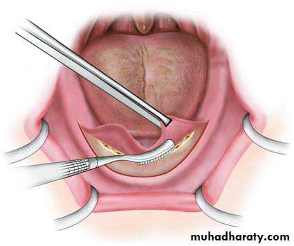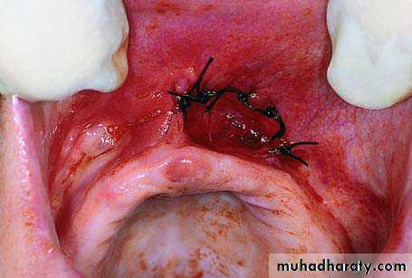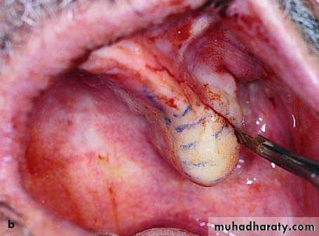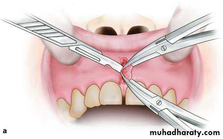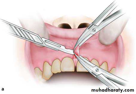 • Excision of the frenum with converging incisions towards the base of the tongue.