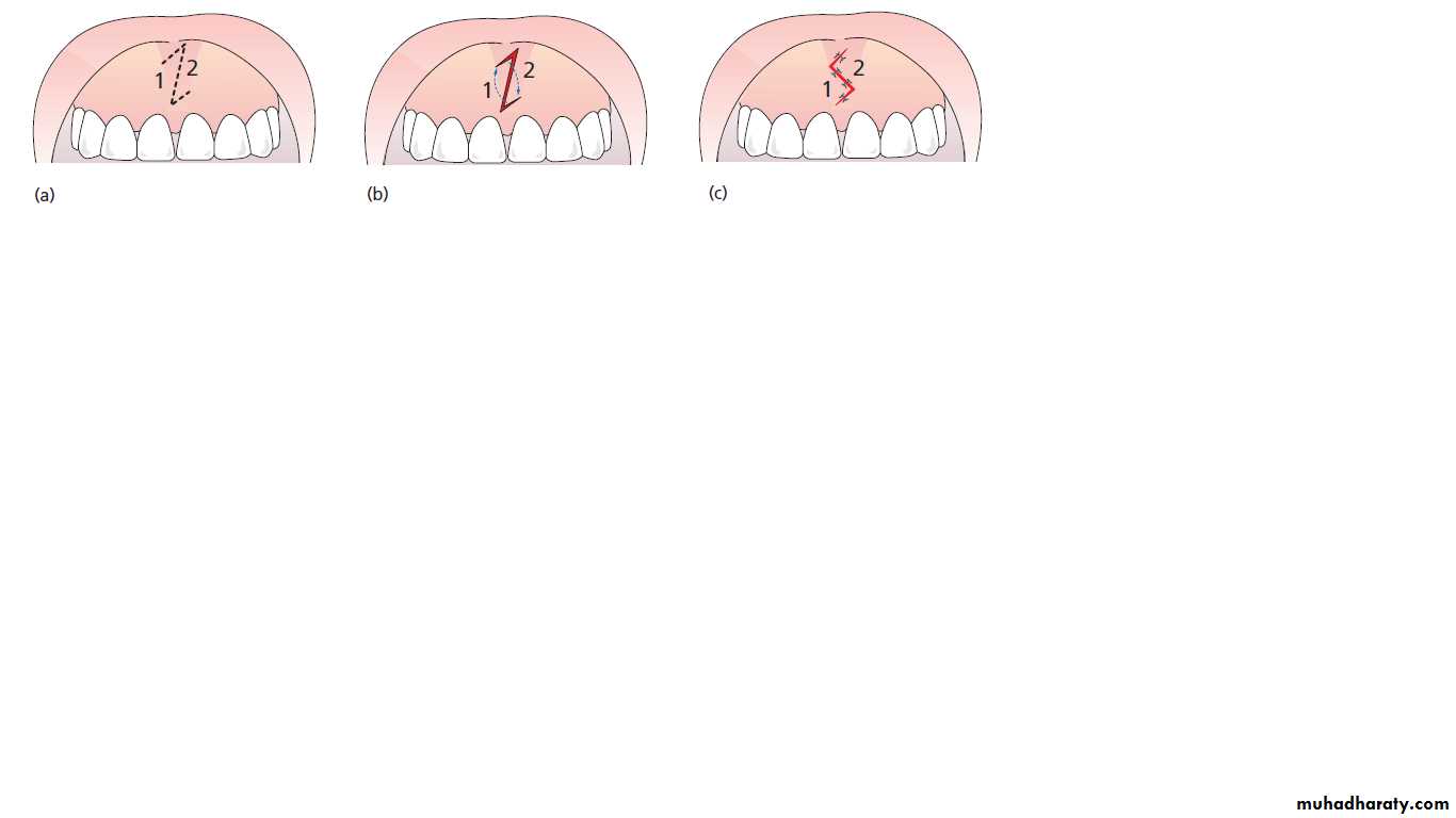 An incision is made directly along the length of a frenum. Superior and inferior incisions are placed to form triangles. After supraperiosteal undermining, the apex of the inferior triangle is rotated upwards and conversely the apex of the superior triangle is rotated downwards.