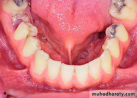 In many cases, the placement of a complete denture of the maxilla, or orthodontic procedures in younger persons requires the removal of the labial frenum, especially if it is hypertrophic. Also, in the mandible, the lingual frenum may create problems, causing partial or complete ankyloglossia. This case is due to attachment of the frenum to the floor of the mouth or to the alveolar mucosa. It may even be the result of an extremely short frenum that is connected to the tip of the tongue. Ankyloglossia greatly limits movements of the tongue, resulting in speech difficulties.