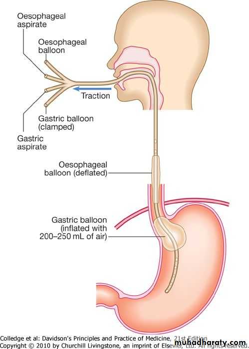 Balloon tamponade (Sengestaken tube) should only be used in uncontrolled bleeding as a temporary ‘‘bridge’’until definitive treatment can be instituted for a maximum of 12 hrs.This technique employs a Sengstaken-Blakemore tube possessing two balloons which exert pressure in the fundus of the stomach and in the lower oesophagus respectively