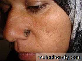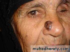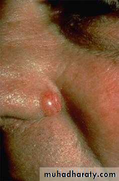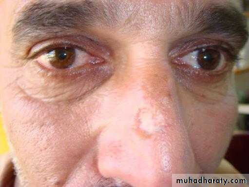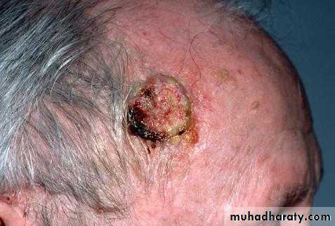 1-nodulo-ulcerative : commonest type, usually single lesion, as pearly or translucent nodule with raised borders and telangiectasias, grow slowly, tend to ulcerate, giving rise “rodent ulcer”.2. Pigmented BCC: second most common type, combines features of nodulo-ulcerative &deep brown to lack brown to black nodule.