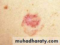 3-Superficial BCC: lightly pigmented erythematous patch, may be scaly, with areas of scarring, mistaken for eczema ,often multiple, on trunk.
