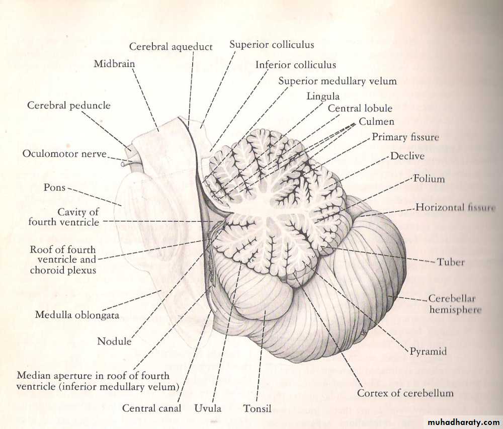 It lies in the posterior cranial fossa, behind the Pons and medulla oblongata and encloses with them the 4th ventricle. It has two surfaces (sup. and inf.), two notches (the ant. and pos. – the anterior one receives the back of the brain stem, while the posterior receives the falx cerebelli). It consist of two hemispheres connected by narrow median vermis, the part of vermis seen from above is the superior vermis, while that seen from inferior surface is the inferior vermis.