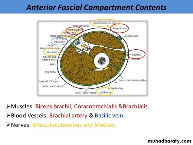N. supply to the muscles: musculocutaneous n.Structures passing through compartment: musculocutaneous n., median n., ulnar n., brachial a., basilic v., radial n. (in lower part)