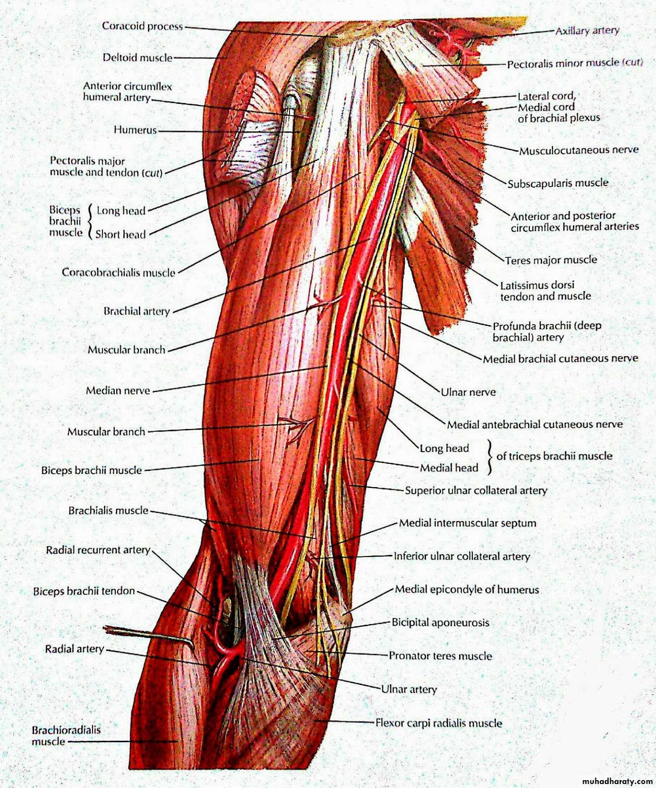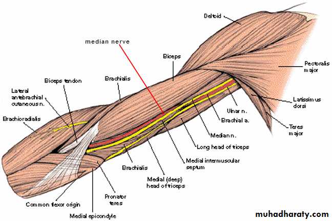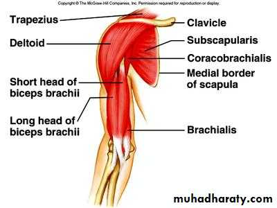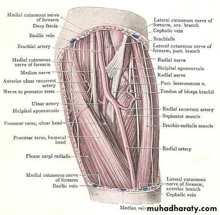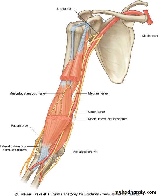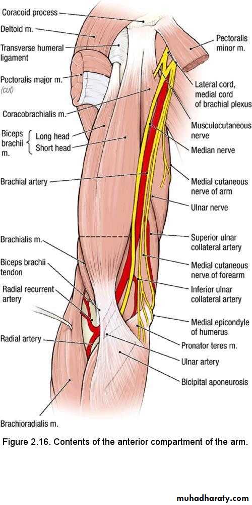 Muscles: biceps brachii, coracobrachialis, brachialis.Blood supply: brachial a.