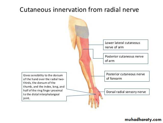 • Muscular branches.• Cutaneous branches: Lateral cutaneous n. of forearm.