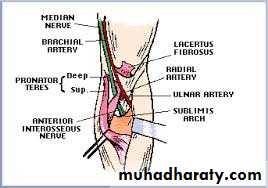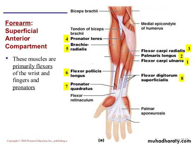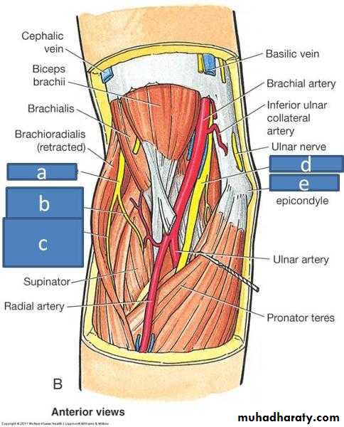 Muscles:Superficial group: pronator teres, flexor carpi radialis, palmaris longus, flexor carpi ulnaris.