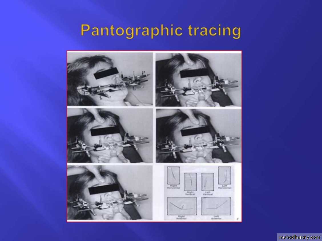 • A graphic record of mandibular movements in three planes as registered by styli on recordable tables of a pantograph, tracing of mandibular movement recorded on plates in horizontal and sagittal planes.• Make the rim contact at desired vertical relationship.