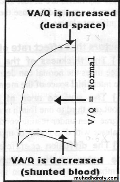 [1]If some areas of the lungs are well ventilated but have no or almost no blood flow, VA/Q = infinity. Therefore, the alveolar air has the same composition and concentration of the humidified inspired air (pO2 = 149 mm Hg, PCO2 = 0.3mm Hg). In normal person in the upright position, both blood flow and alveolarventilation are considerably less in the upper part of the lung than in the lower part. However, blood flow is decreased considerably more than ventilation because the low-pressure pulmonary capillaries at the lung apices are compressed by the higher-pressure lung alveoli. Therefore, at the top of the lung, VA/Q is as much as three times as great as the ideal value, which causes a moderate degree of physiologic dead space in this area of the lung. VA/Q equal to infinity does not occur in the normal lung but instead occurs only in abnormal conditions such as in some lung diseases, a fall in arterial pressure (following haemorrhage) or breathing against a high pressure as occurs when a person is blowing on a musical instrument. Breathing against a high pressure causes a compression of the pulmonary capillaries by the high alveolar pressure. In some chronic obstructive lung diseases such as emphysema, some areas of the lungs exhibit very serious physiologic shunt and other areas very serious physiologic dead space. Both of these tremendously decrease the effectiveness of the lungs as gas exchange organ.