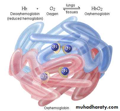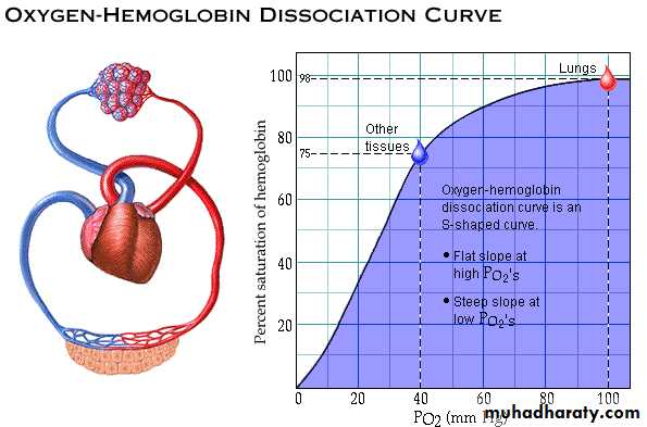 Myoglobin:It is an iron-containing pigment found in skeletal muscle. It resembles Hb but binds one rather 4 mol of O2 per mol. Its dissociation curve is a rectangular rather than a sigmoid curve. Because its curve is to the left of the Hb curve, it takes up O2 from Hb in the blood. It releases O2 only at low PO2 values, but the PO2 in exercising muscle is close to zero. The muscle blood supply is compressed during contractions, and myoglobin may provide O2 when blood flow is cut off.
