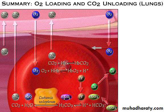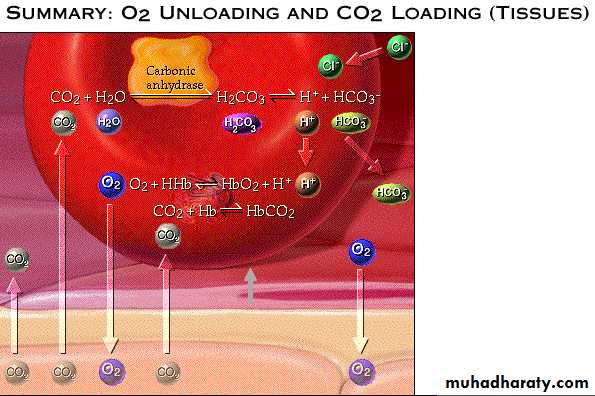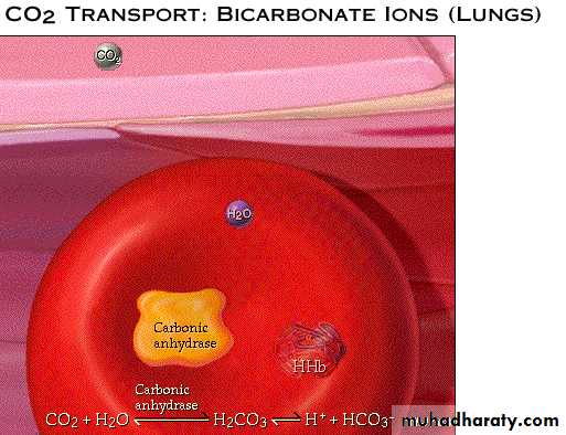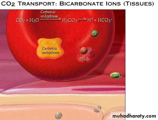 In the tissues( regions with high PCO2) CO2 enters RBC combines with water to form carbonic acid.This reaction is catalyzed by carbonic anhydrase enzyme. Similar reaction occurs in plasma but without enzyme it is very slow.Carbonic acid dissociates into H+ and bicarbonate.Hydrogen ions is buffered by Hb forming(H-HB).To maintain electrical neutrality,bicarbonate ions diffuse out of RBC in exchange with chloride ions(chloride shift).Within the plasma,bicarbonate ions act as pHbuffer. .