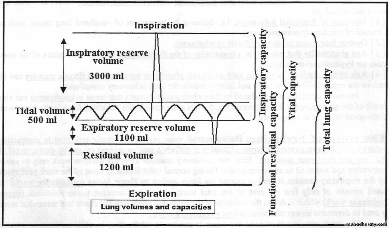The Work Of Breathing:During normal quiet respiration, respiratory muscle contraction occurs only during inspiration, whereas expiration is entirely a passive process caused by elastic recoil of the lung and chest cage structures. Thus, the respiratory muscles normally perform work only to cause inspiration and not at all to cause expiration. During normal quiet breathing most of the work performed by the respiratory muscles is used to expand the lungs against its elastic forces (compliance work). A small amount of only few per cent of the total work is used to overcome tissue resistance (tissue resistance work) which is due to the viscosity of the lungs and chest wall structures and somewhat more is used to overcome airway resistance (airway resistance work).