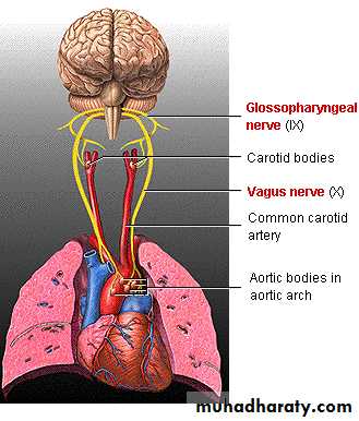B: Peripheral chemoreceptors(carotid and aortic bodies):Carotid bodiesare located bilaterally in the bifurcations of the common carotid arteries, and their afferent never fibers pass to the glossopharyngeal nerves and thence to the dorsal respiratory area of the medulla. Aortic bodies are located along the arch of the aorta, and their afferent fibers pass through the vagito the dorsal respiratory area.