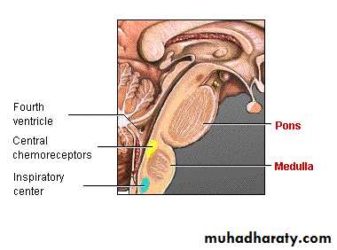 A: Central chemoreceptors: Surplus of CO2 or H+ affected respiration mainly by excitatory effects on the respiratory center itself, causing greatly increased strength of both the inspiratory and expiratory signals to the respiratory muscles. The resulting increase in ventilation (4-fold increase caused by decreasing the blood pH or 11-fold increase caused by increasing PCO2) increases the elimination of CO2 from the blood, this also removes H+ from the blood because decreased CO2 also decreases the blood carbonic acid. It is believed that the blood CO2 and H+ do-not affect the respiratory centers directly. Instead, achemosensitive area located bilaterally only a few microns beneath the surface of themedulla ventral to the entry of the glossopharyngeal and vagal nerves into the medulla, this area is highly sensitive to changes in H ion concentration, and it in turn excites the other portions of the respiratory center. It has especially potent effects on increasing the degree of activity of the inspiratory center, increasing both the rate of rise of the inspiratory ramp signals and also the intensity of the signal. However, H+do not easily cross either the blood-brain barrier or the blood-cerebrospinal fluid barrier. For this reason, changes in H+ concentration in the blood actually have considerably less effect in stimulating the chemosensitive neurons than do changes in CO2. This is because CO2 passes through blood-brain barrier and blood-cerebrospinal fluid barrier very easily. Consequently, whenever the blood CO2 concentration increases, the PCO2 in both the interstitial fluid of the medulla and in the cerebrospinal fluid also increase. In both of these fluids the CO2 immediately reacts with the water to form carbonic acid which dissociates into H+ and bicarbonates. Thus, paradoxically, more H+ are released into the respiratory chemosensitive sensory area when the blood CO2 concentration increases than when the blood H+ concentration increases. For this reason, respiratory center activity is affected considerably more by changes in blood CO2 than by changes in blood H+.The stimulatory effect of increased CO2 on respiration reaches its peak within a few minutes after an increase in blood PCO2. Thereafter, the stimulation gradually declines for the next one to two days to as little as one-fifth the initial effect due to adaptation of the receptors. Therefore, A change in blood CO2 concentration has a very potent acute effect on controlling respiration but only a weak chronic effect after a few days' adaptation.