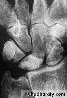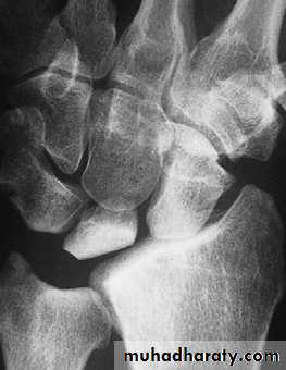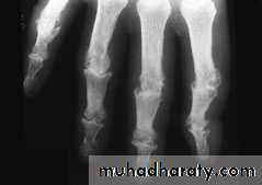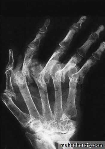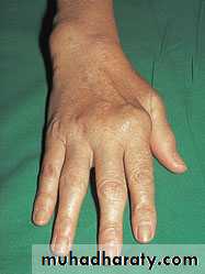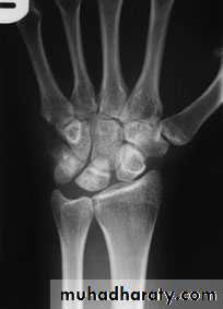 Late deformity: the carpus settles into radial tilt and volar subluxation; there is marked ulnar drift of the fingers and volar dislocation of the MCP joints, often associated with multiple swan-neck and boutonnière deformities.